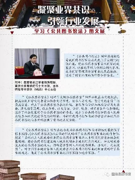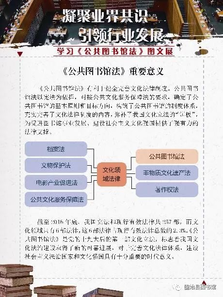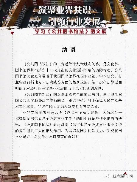为深入落实党的十九大精神,大力宣传《公共图书馆法》,我馆将在一楼大厅和我馆微信公众号同步展出以“凝聚业界共识,引领行业发展”为主题的《公共图书馆法》图文展览,展览时间2018年1月1日--31日。