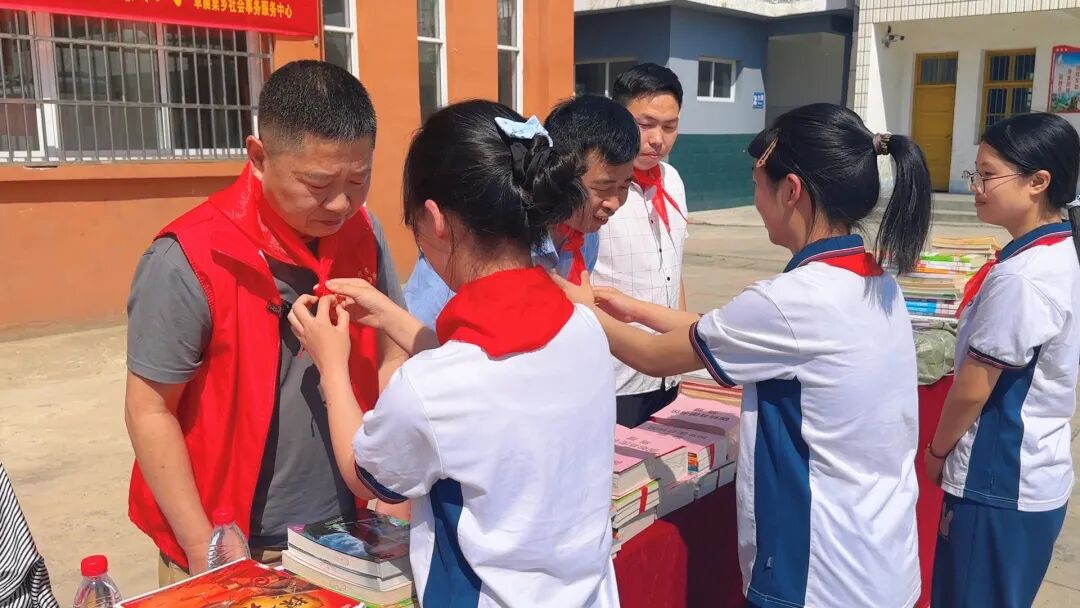 少先队员代表为参加活动的领导献上鲜艳的红领巾,固始县图书馆馆长竹安珉及王岗小学校长张其贵分别致辞。