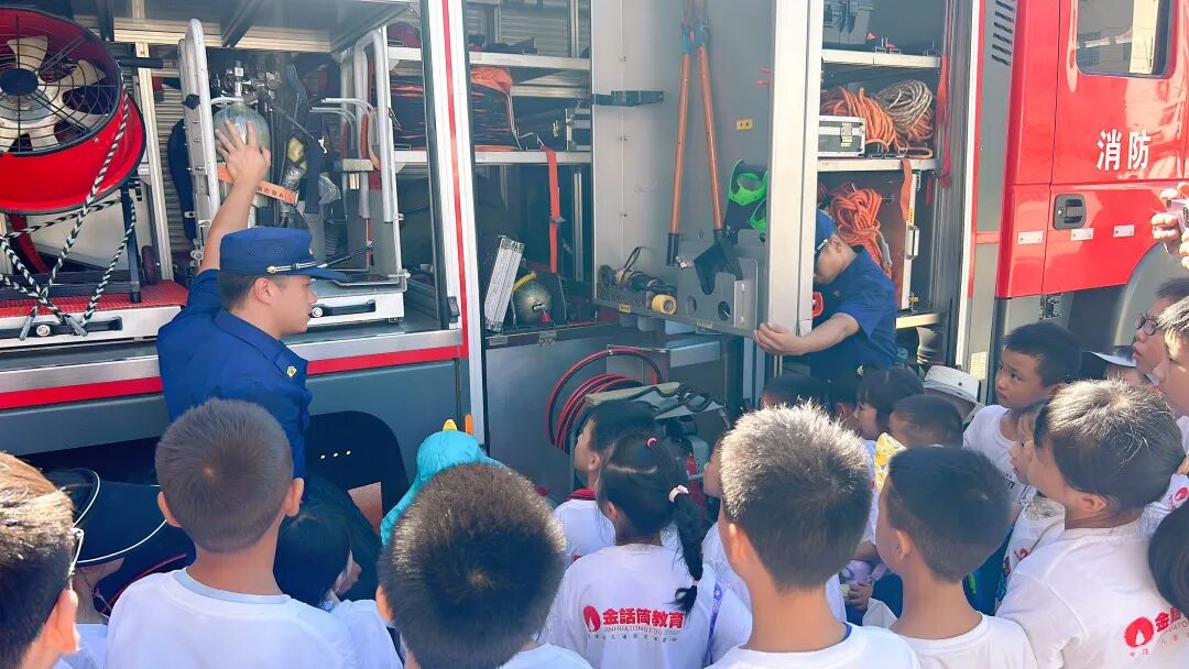 活动中,消防员通过讲解与示范相结合的形式,用通俗易懂的语言对各类消防器材装备的名称、性能和使用方法进行介绍。根据小朋友年龄小、好奇心强、活泼好动的特点,消防指战员还采取互动提问的形式,讲解了如何预防火灾发生、如何报火警、火场如何逃生自救等消防安全常识,让小朋友在轻松愉快的过程中收获知识与快乐。