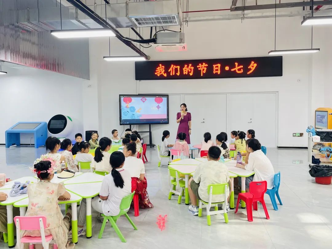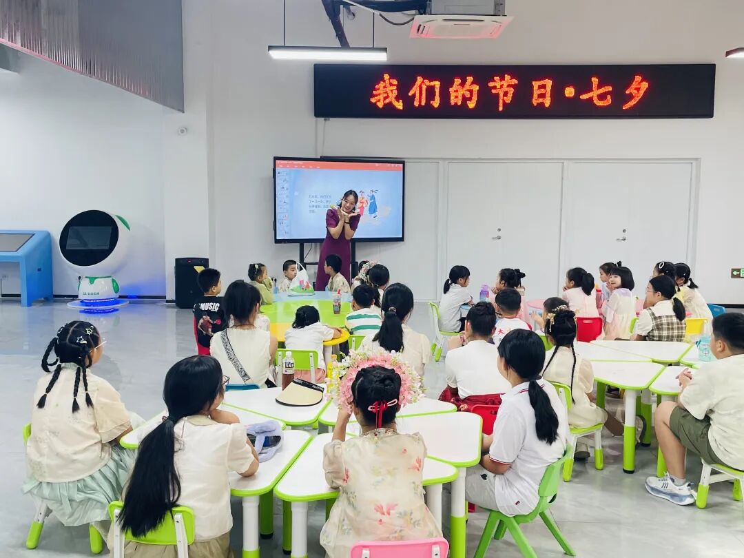 来自千艺书画社的李老师为孩子们讲解了“七夕节”的由来及文化内涵。七夕节,又称七巧节、七姐节、女儿节、乞巧节等,是中国民间的传统节日。经历史发展,七夕被赋予了“牛郎织女”的美丽爱情传说,使其成为了象征爱情的节日,从而被认为是中国最具浪漫色彩的传统节日,在当代更是产生了“中国情人节”的文化含义。