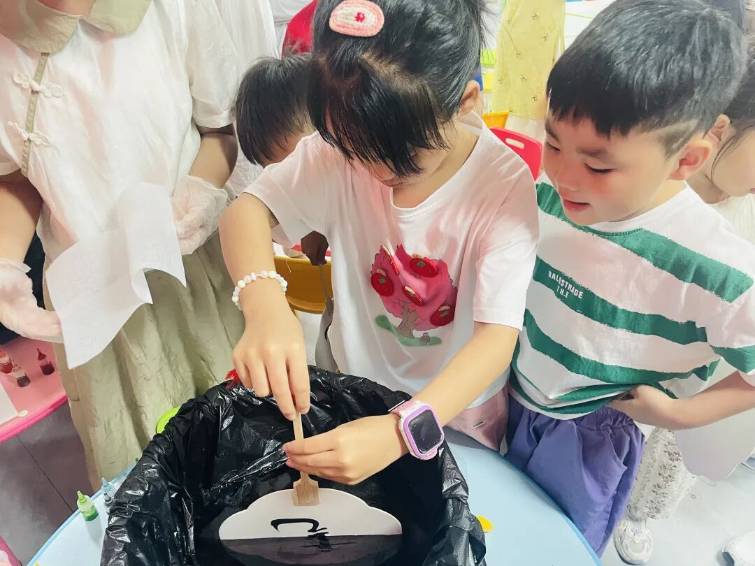 李老师从漆扇的历史、漆扇的发展以及漆扇的制作手法等方面来介绍漆扇非遗。在互动环节,准备了几个小问题来检验大家的学习成果,小朋友们踊跃回答,在老师的指导下,孩子们认真挑选喜欢的漆料,充分发挥自己的创造力和想象力,将扇面浸染得五彩斑斓、流光溢彩,制作出一个个独一无二的漆扇。