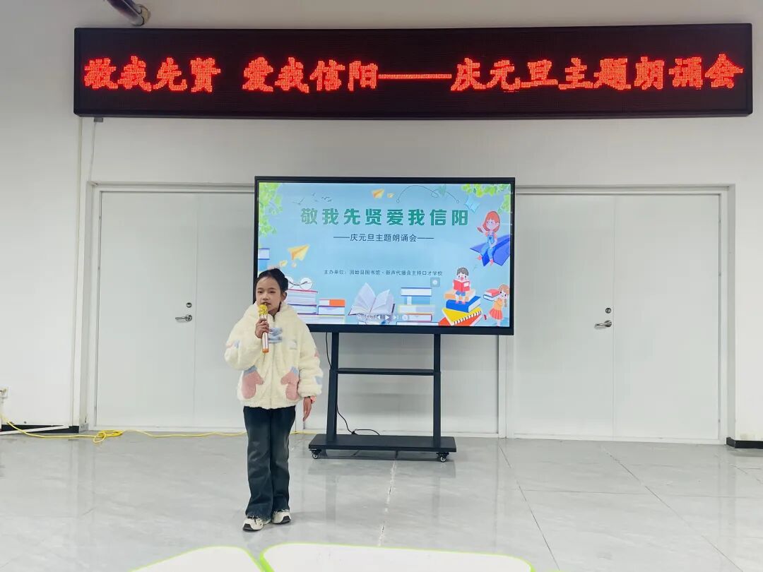 岁月更迭,时光的车轮又留下了一道深深的印痕。伴随着冬日里温暖的阳光,2025年即将如约而至。为庆祝新年的到来,丰富广大读者的文化生活,提升图书馆的文化氛围,12月29日下午,固始县图书馆联合新声代播音主持口才学校在少儿阅览室开展“敬我先贤 爱我信阳”元旦主题朗诵会活动。