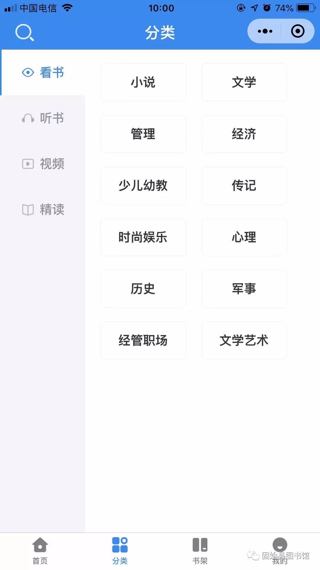 在“分类”这里,分别点击看书、听书、视频、精读菜单,可浏览更多详细的分类,便于大家找到自己想浏览的书籍或音视频。