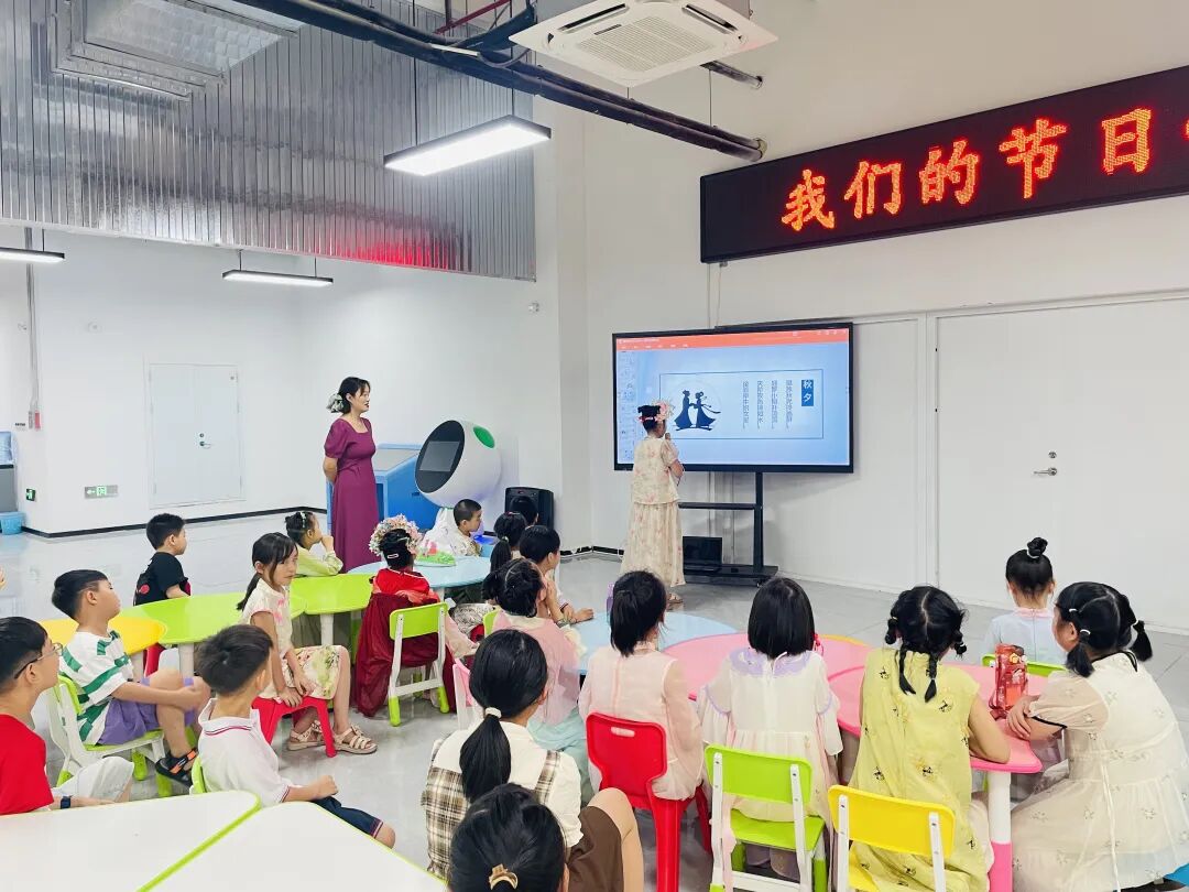 来自千艺书画社的李老师为孩子们讲解了“七夕节”的由来及文化内涵。七夕节,又称七巧节、七姐节、女儿节、乞巧节等,是中国民间的传统节日。经历史发展,七夕被赋予了“牛郎织女”的美丽爱情传说,使其成为了象征爱情的节日,从而被认为是中国最具浪漫色彩的传统节日,在当代更是产生了“中国情人节”的文化含义。