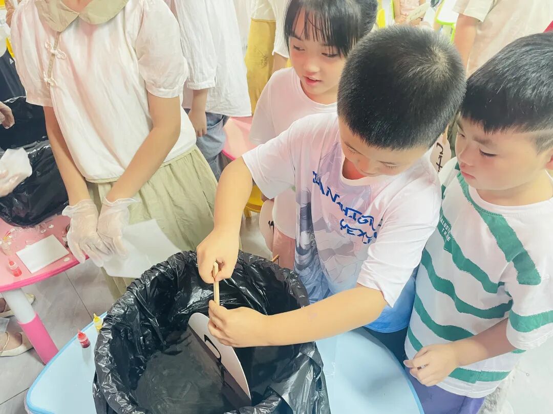 李老师从漆扇的历史、漆扇的发展以及漆扇的制作手法等方面来介绍漆扇非遗。在互动环节,准备了几个小问题来检验大家的学习成果,小朋友们踊跃回答,在老师的指导下,孩子们认真挑选喜欢的漆料,充分发挥自己的创造力和想象力,将扇面浸染得五彩斑斓、流光溢彩,制作出一个个独一无二的漆扇。