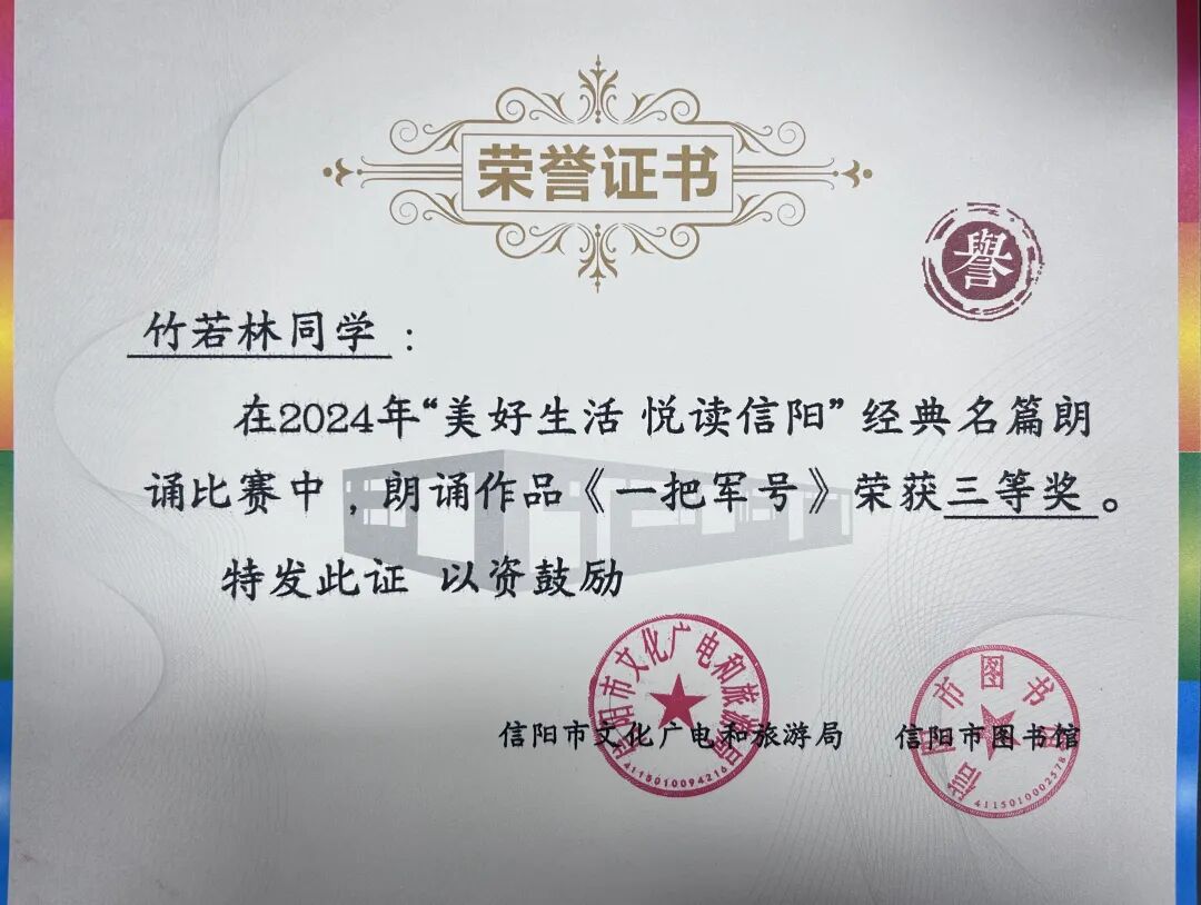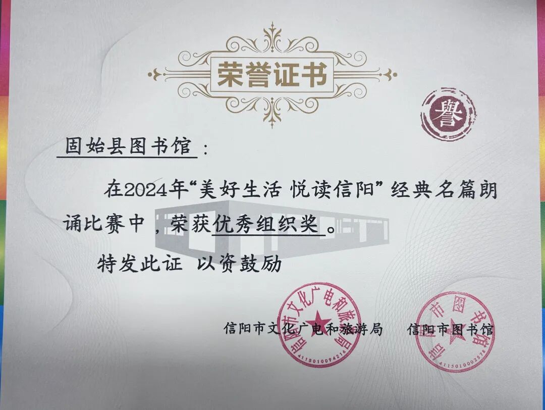 固始县图书馆2024年按照《关于印发〈信阳市文化广电和旅游局2024年“美好生活 悦读信阳”经典名篇朗诵比赛活动方案〉的通知》,认真研究组织策划举办了固始赛区比赛。通过预赛、决赛选出少儿组及成人组一等奖,并代表固始县参加信阳市总决赛,在活动中表现突出,获得佳绩。